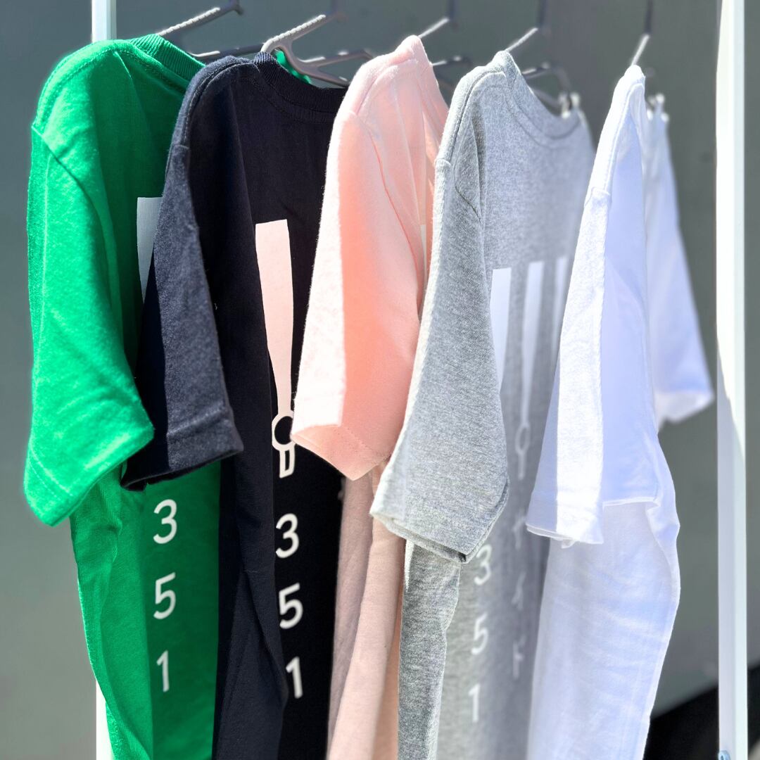 写真はWHITEとGRAYが150サイズ、NAVYとPINKとGREENが130サイズです。